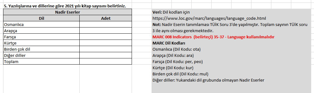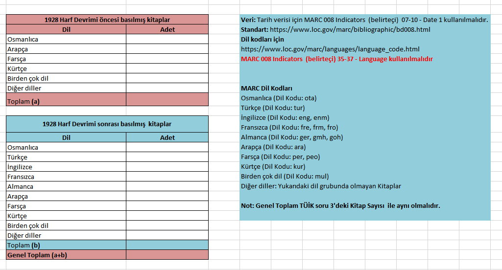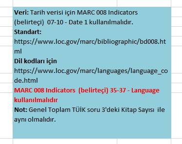 Not: Kütüphane otomasyon sistemlerinden rapor alınırken tarih verisi için MARC 008 Date 1 belirteci ile Dil için ise 35-37-Language belirtecinin kullanılmasının önemli olduğunu düşünüyorum. Sizce verileri oluşturmak için bu MARC belirteçleri yeterli midir?
