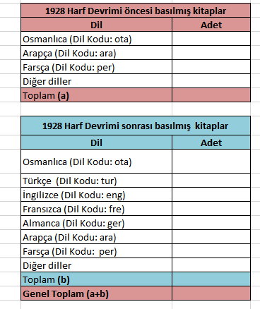 “Yazılışlarına ve dillere göre”, “1928 Harf Devrimi öncesi basılmış kitaplar” ve “1928 Harf Devrimi sonrası basılmış kitaplar” şeklinde tabloların ayrı ayrı olması daha sade ve anlaşılır olmuş…