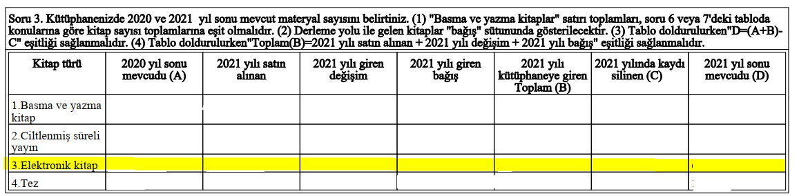 Örnek: 2021 yıl sonu mevcut verisi hesaplanırken 2021 yılında satın alınan E-Kitaplar ile önceki yılda satın alınan E-Kitapların toplam sayısının girişi yapılmalıdır.   Örneğin: 2020 yılında toplam E-Kitap sayısı 500 olsun 2021 yılında da 70 E-Kitap satın alınmış olsun.
