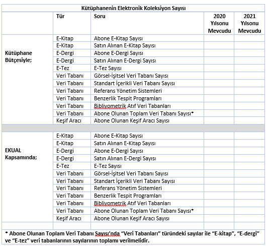 Not: Kütüphanenin  yayın alımları bütçesi ile ödemesini yaptığı  abone  E-Kitapların toplam sayısının girişi yapılmalıdır. EKUAL  ile erişime açılan veritabanları içerisindeki E-Kitaplar ile Abone Veritabanları içerisinde bulunan açık erişim e-kitaplar istatistiğe dahil edilmemelidir.