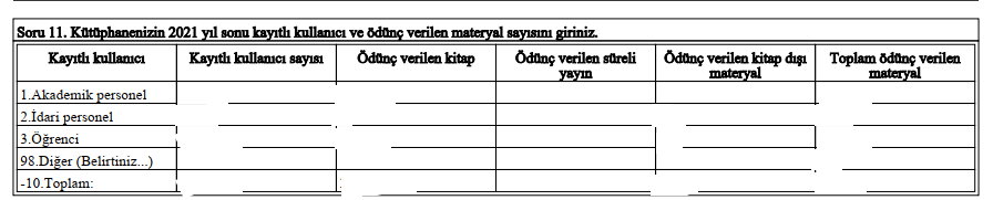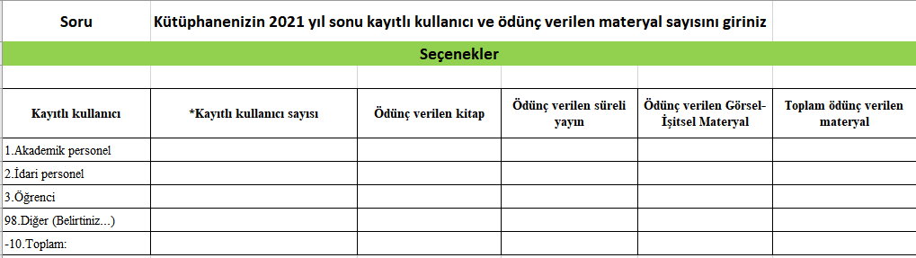 | Ödünç verilen kitap: Kitapların yıllık Ödünç ve Süre uzatım toplam sayısı veri girişinde kullanılmalıdır. |