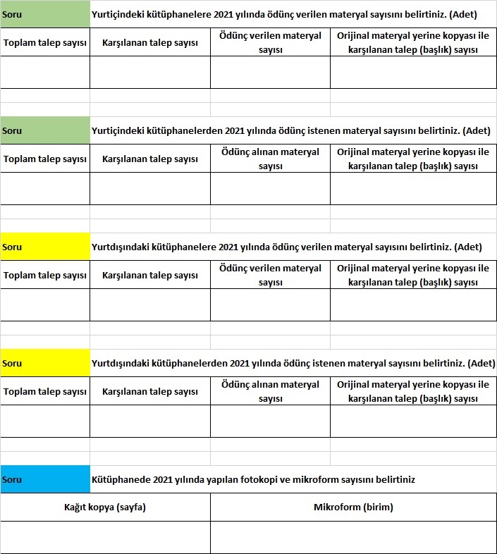 | Ödünç verilen materyal sayısı: İlgili yıl içinde ödünç verilen materyaller ayrı ayrı sayılarak Ödünç Verilen Materyal Sayısı bulunacaktır. |