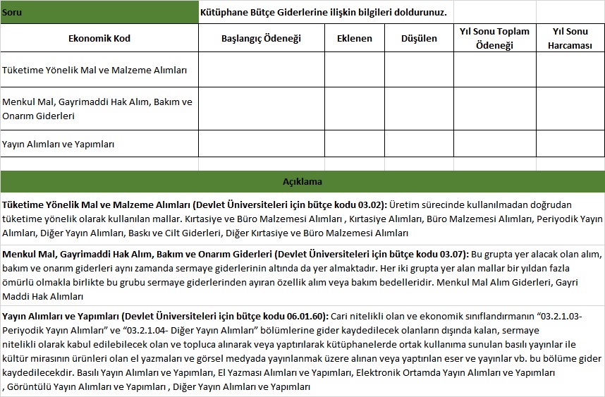Mevcut TÜİK Sorularında yayın alımları harcamalarına yönelik soru bulunmamaktadır. Aşağıdaki iki tablo Kütüphanelerin Faaliyet Raporlarında bulunmaktadır. Bütçe düzey kodları farklı olsa da Kütüphanelerin en çok kullandığı ekonomik kodlardır.